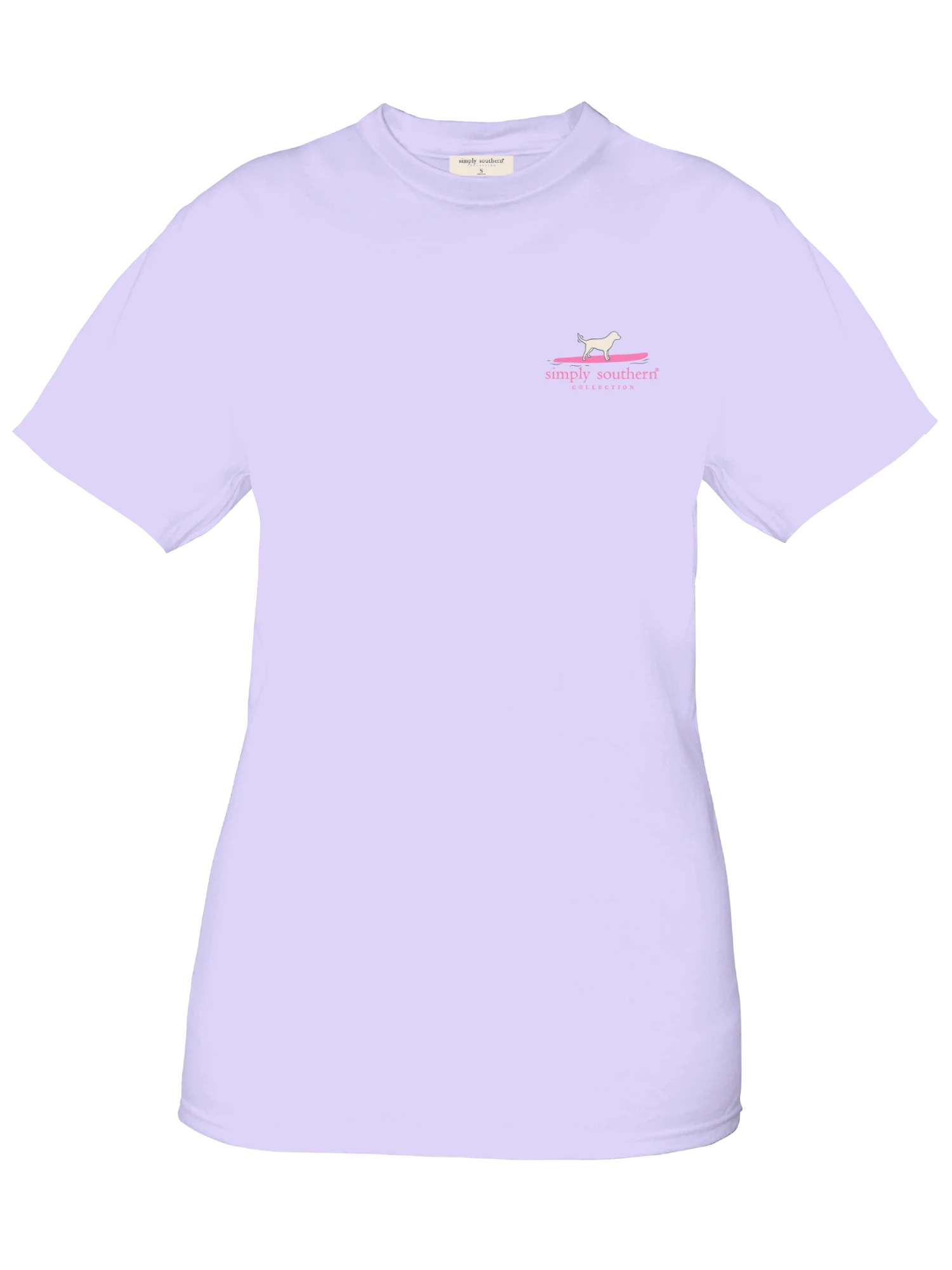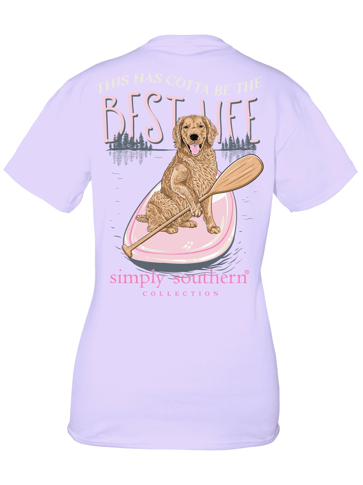 Aster purple short sleeve shirt with a dog on a paddle board and the phrase ‘This has gotta be the best life’. Simply Southern logo below and on left chest.