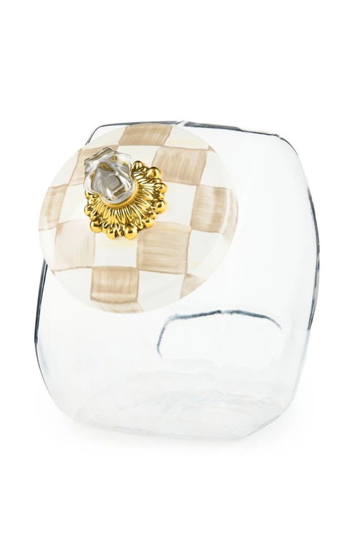 Glass jar; lid has heavy-gauge, hand-glazed steel underbody with hand-painted Mocha Checks. Knob assembly includes brass bobeche and glass finial. Pieces may vary due to the handmade nature of each product. Imported.