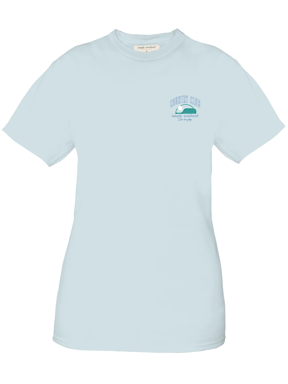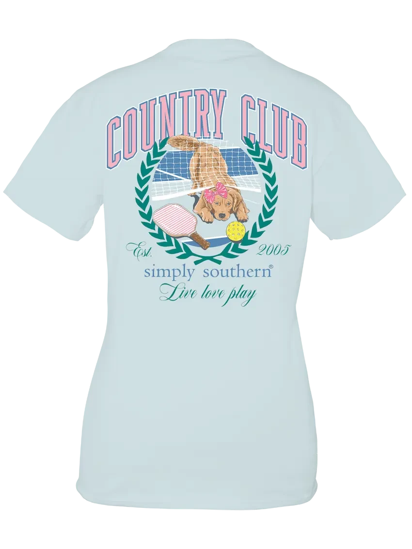 Spout blue short sleeve shirt with a dog on a pickleball court and the phrases ‘Country Club’ and ‘Live Love Play’. Simply Southern logo below and on left chest.