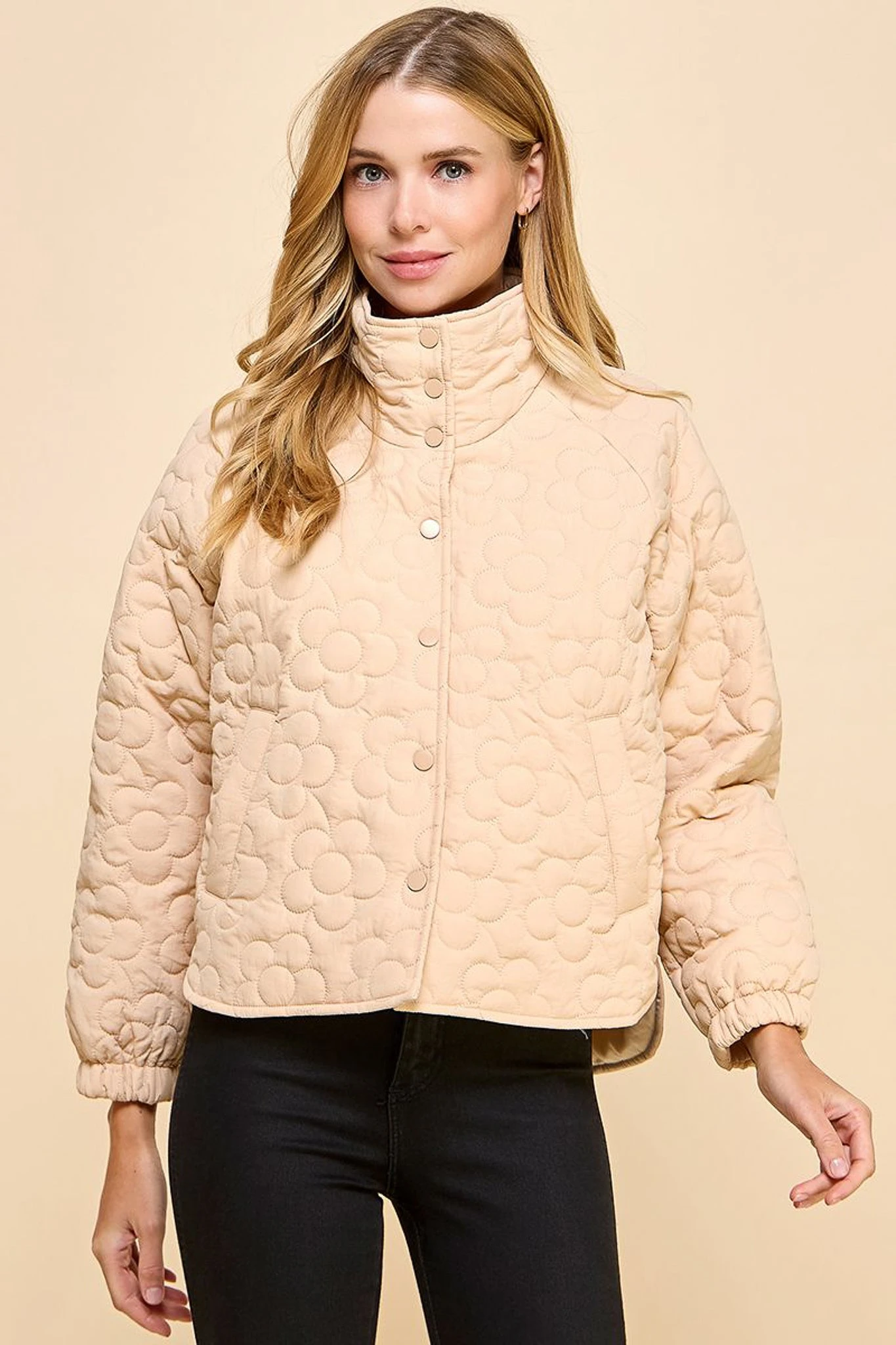 Textured floral quilted jacket with a button down detail and side pockets. 100% Polyester.