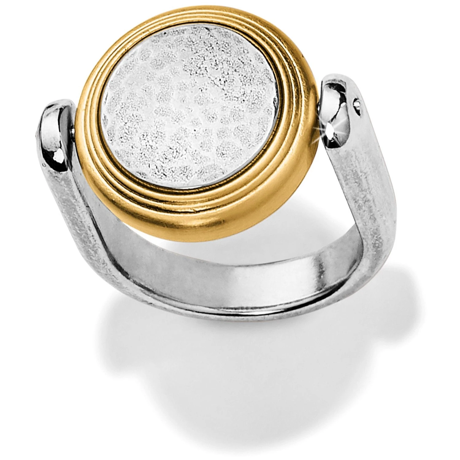 The Ferrara motif comes to life in three-dimensional mixed metals and filigree. Its center ornament reverses to a hammered silver texture, with gold on the perimeter.