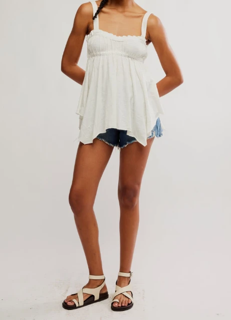 Sweet and so staple, this flowy babydoll tank is featured in an airy cotton fabrication with a ruched bust and playful fairy hem.