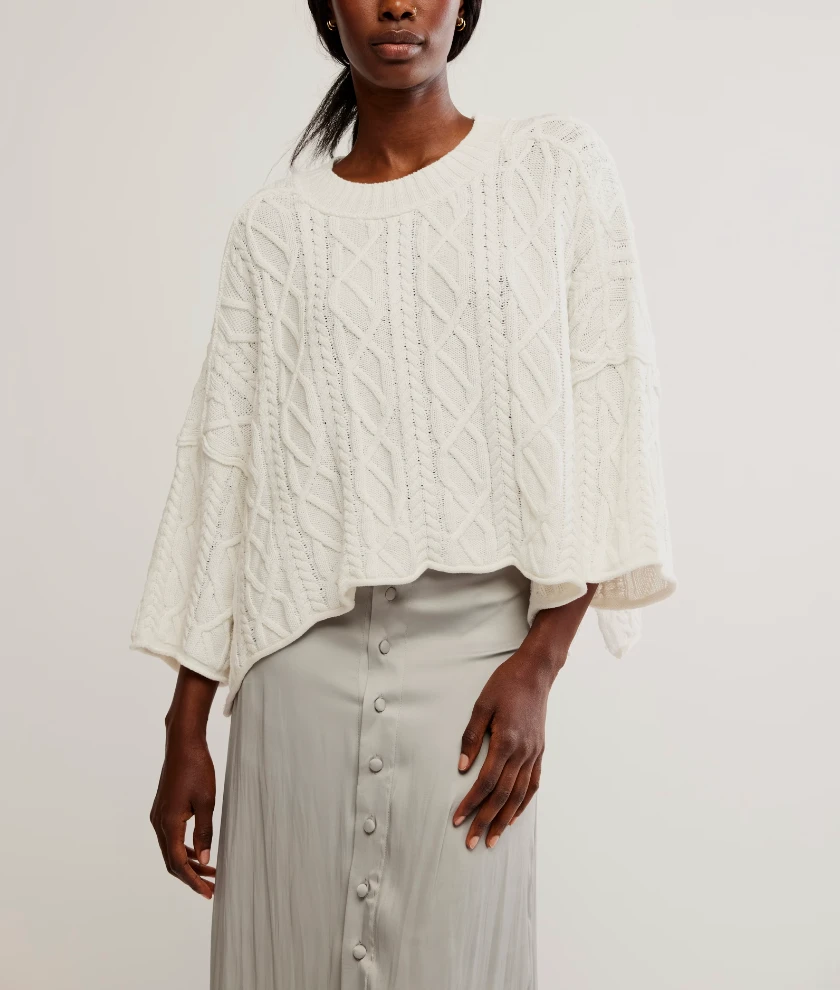 Features: Asymmetrical hemline, classic cable knit fabrication, dropped shoulder sleeves