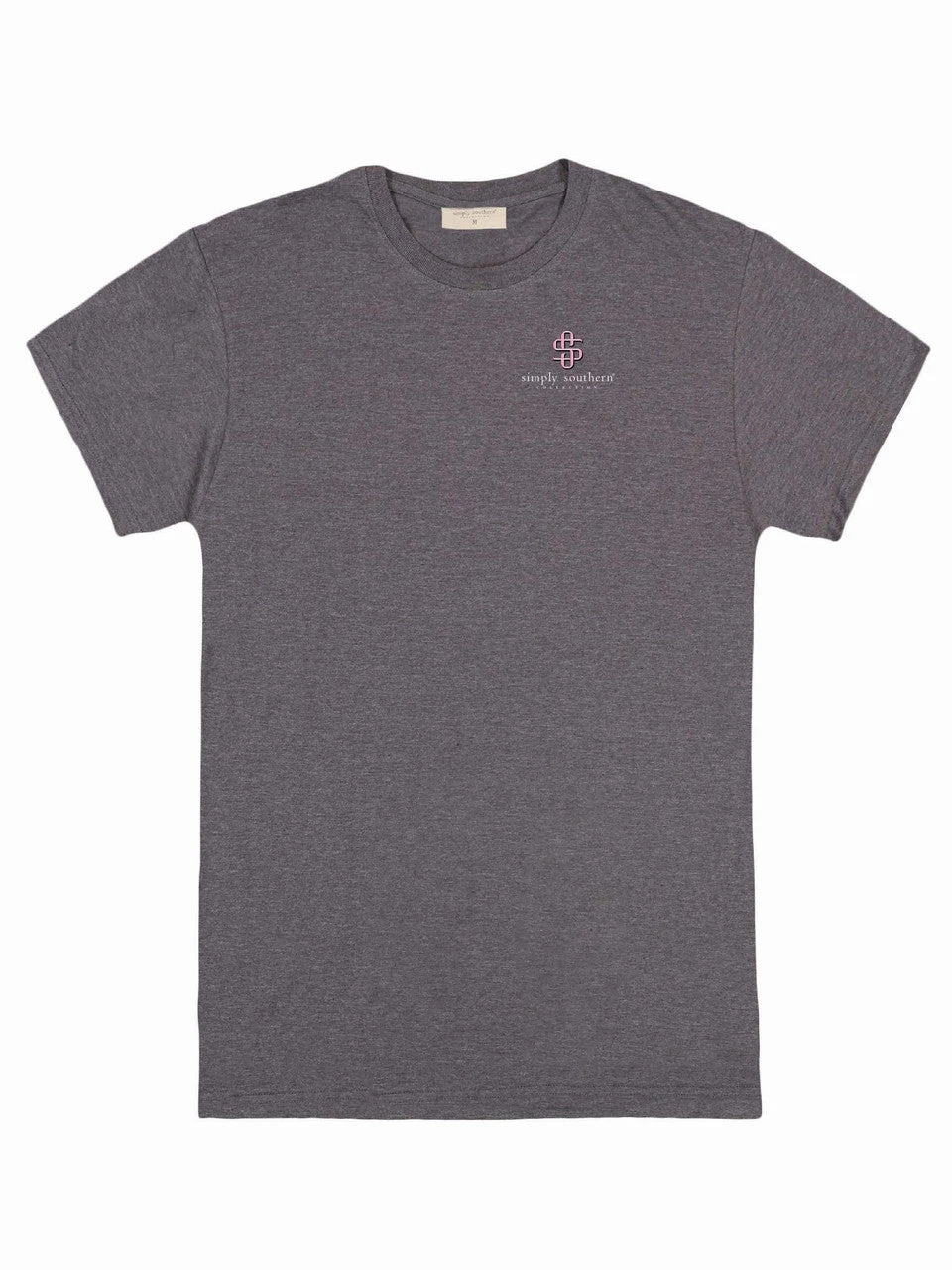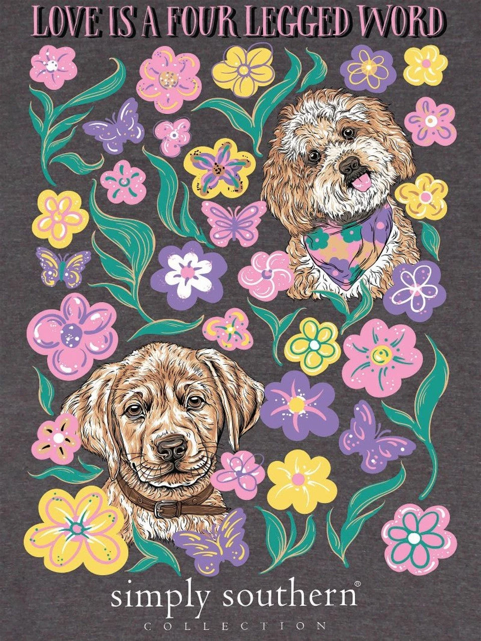 Dark heather grey short sleeve shirt with the phrase ‘Love is a four legged word’ and two dogs in a collection of bright flowers. Simply Southern logo below and on left chest. 98% cotton / 2% polyester blend. Unisex sizing.