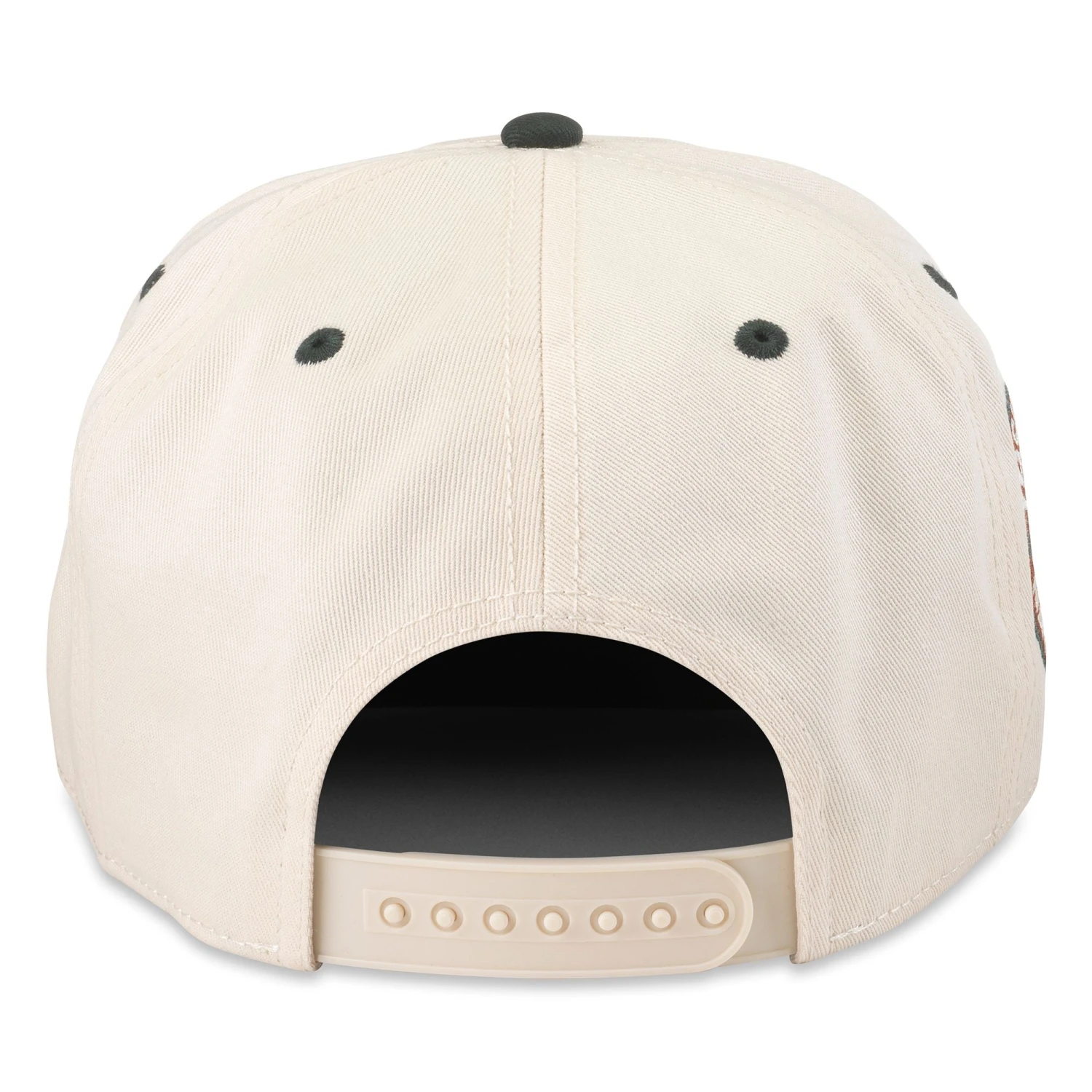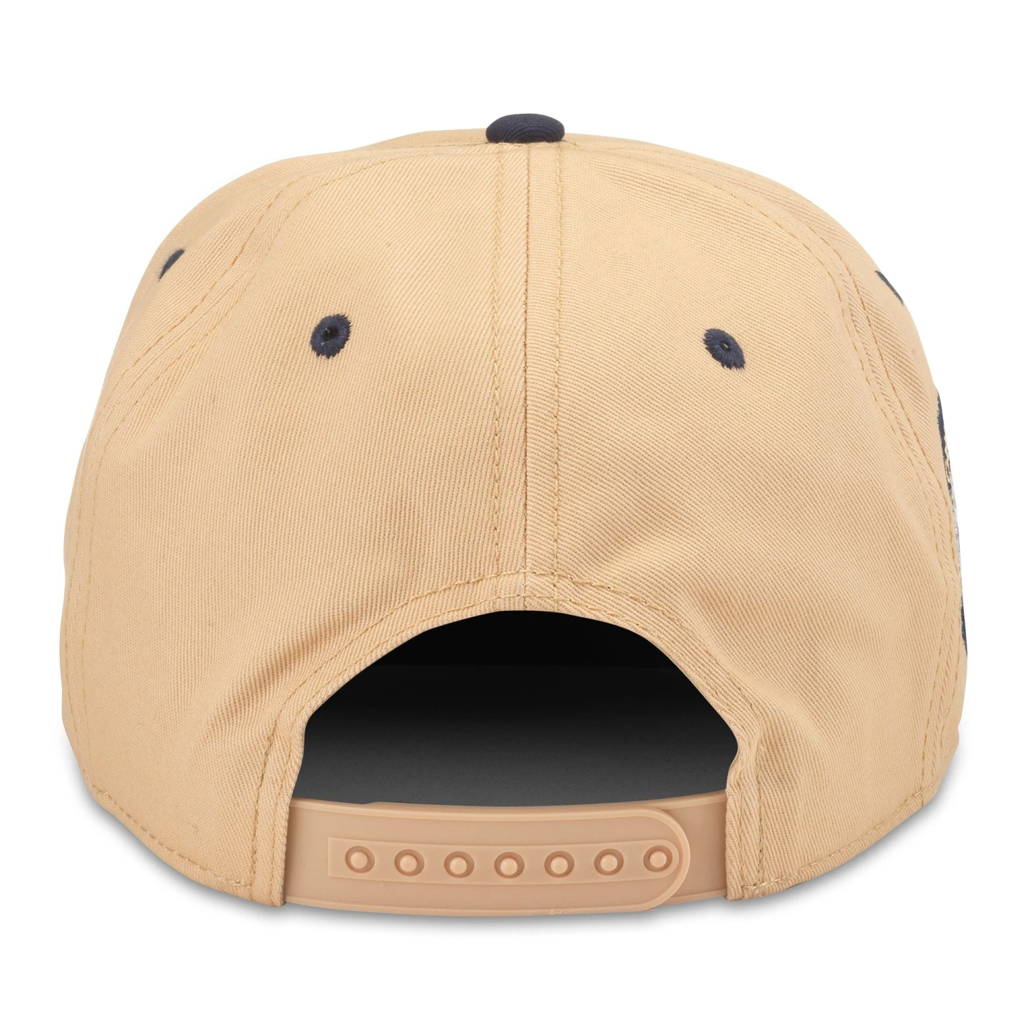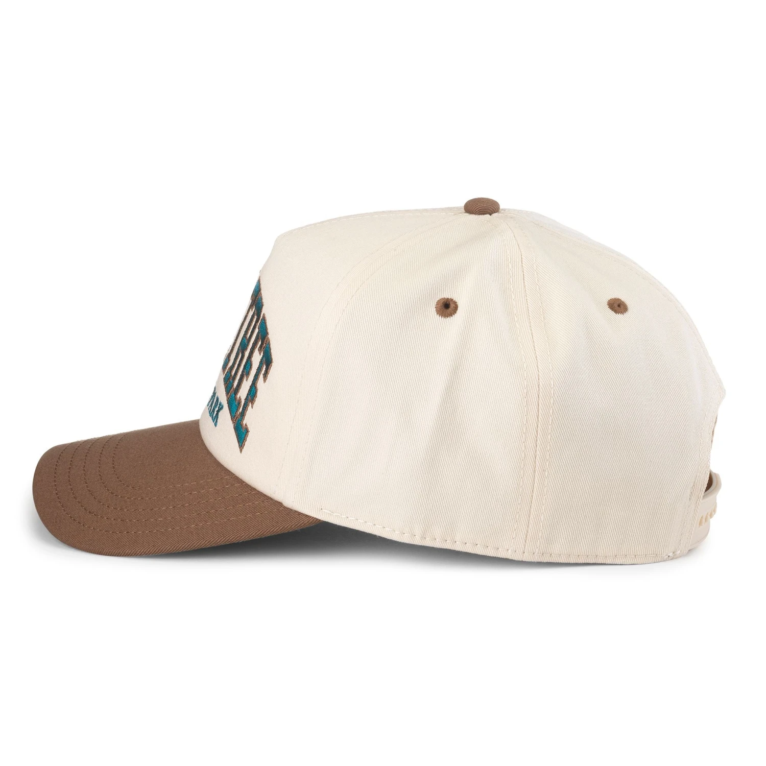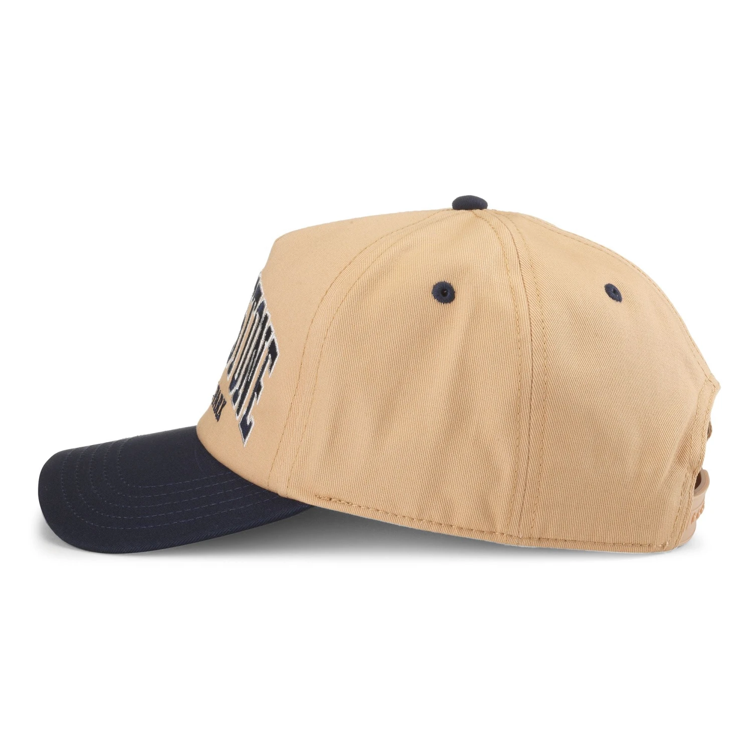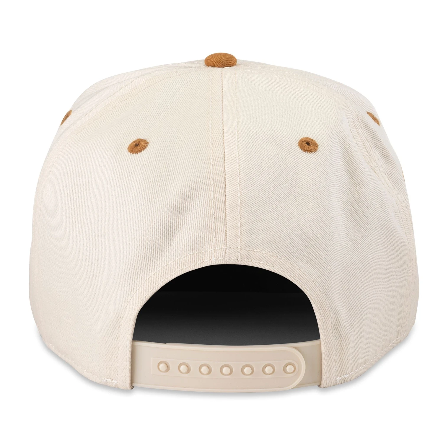 Washed Twill 5-panel with soft structured crown and slight curved visor. Braided nylon cord across seam and plastic snap closure. Front logo is merrowed twill patch or embroidery.