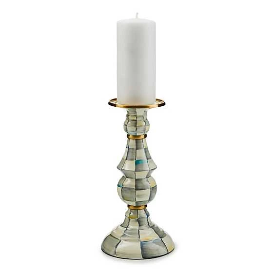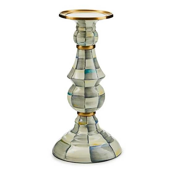 Make an enlightening statement of style by displaying your pillar candles on the Large Sterling Check® Enamel Pillar Candlestick. Made of a heavy-gauge, hand-glazed steel underbody with hand-painted grey checks, it’s embellished with brass accents and rimmed in bronzed stainless steel.