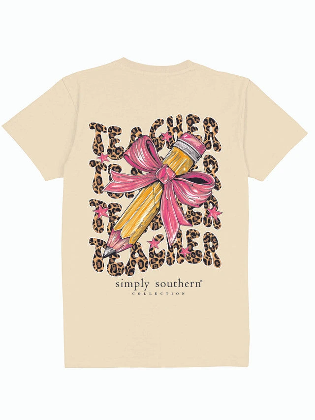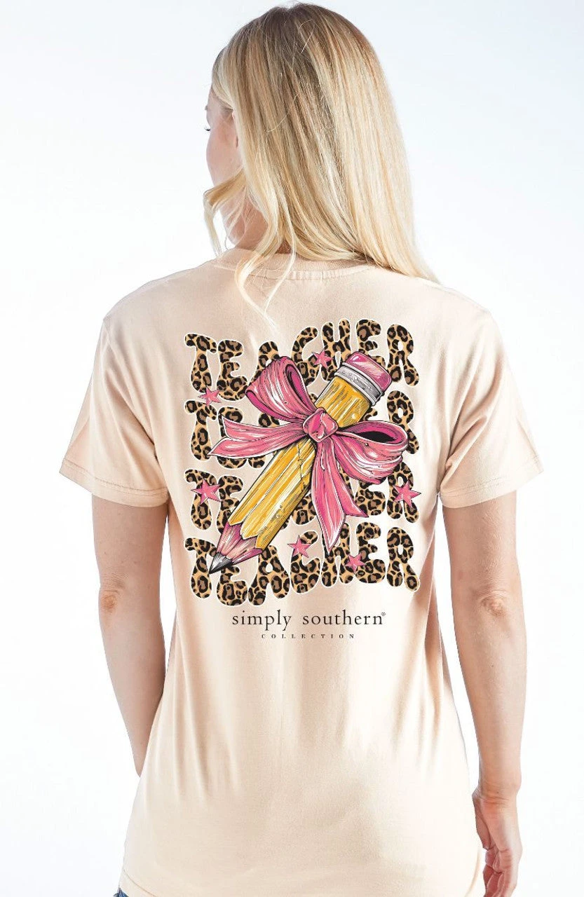 Natural tan short sleeve shirt with the word ‘Teacher’ in cheetah print repeating as a backdrop to a pink bow tied to a pencil. Simply Southern logo below. Similar design on left chest. 100% cotton. Unisex sizing.