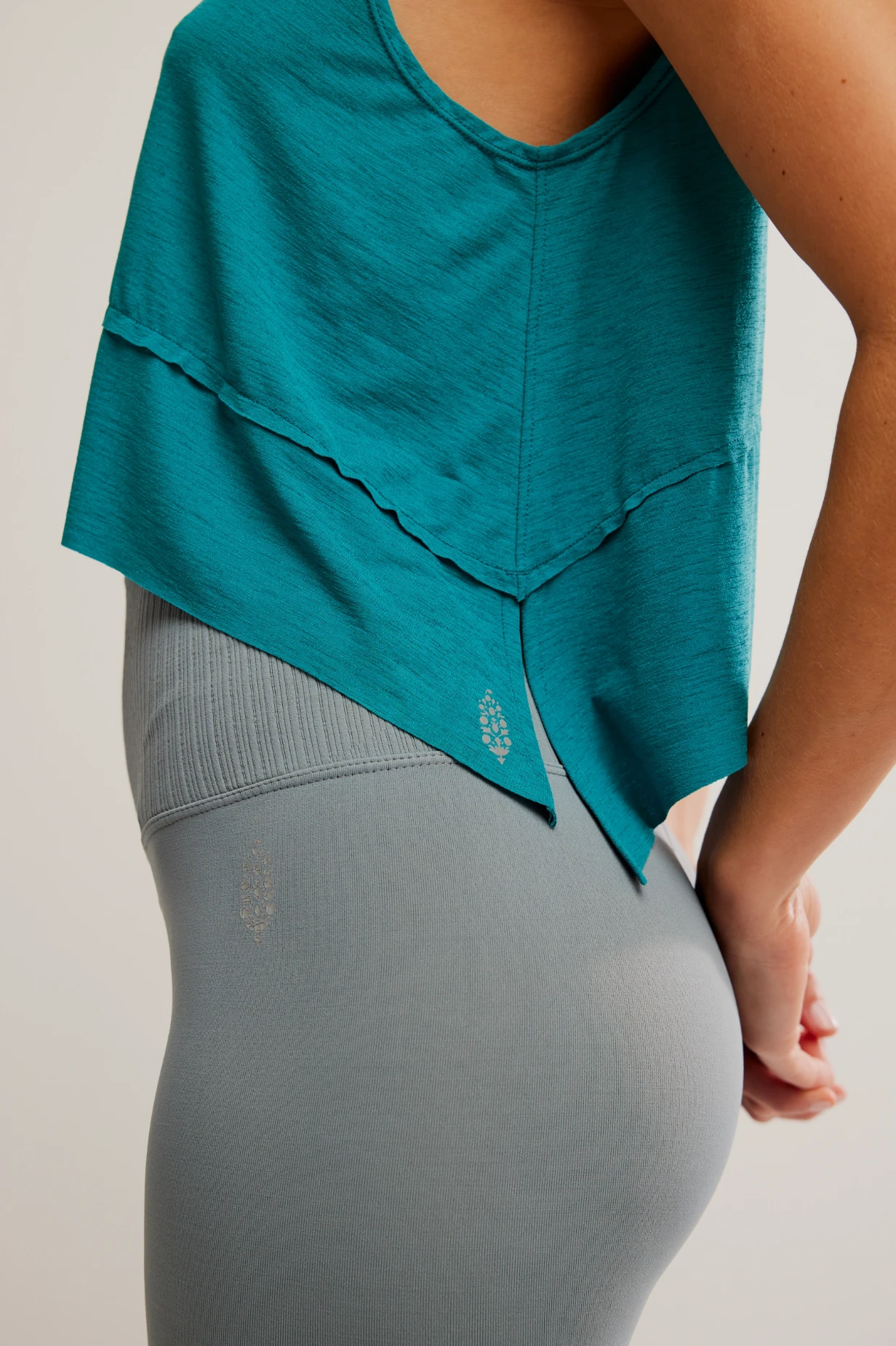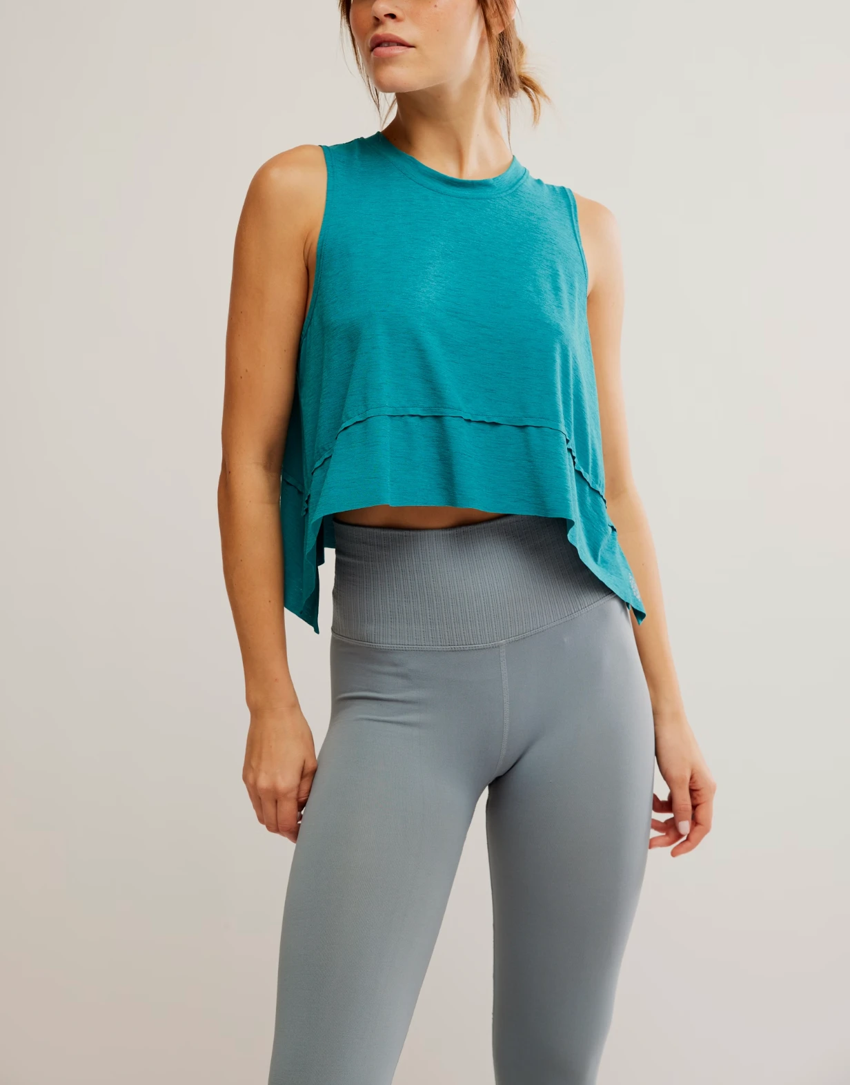 Features:Â Soft, breathable fabrication; sweat-wicking; four-way stretch; curved hemline hits right at waist; raw seam detailing; scoop neckline