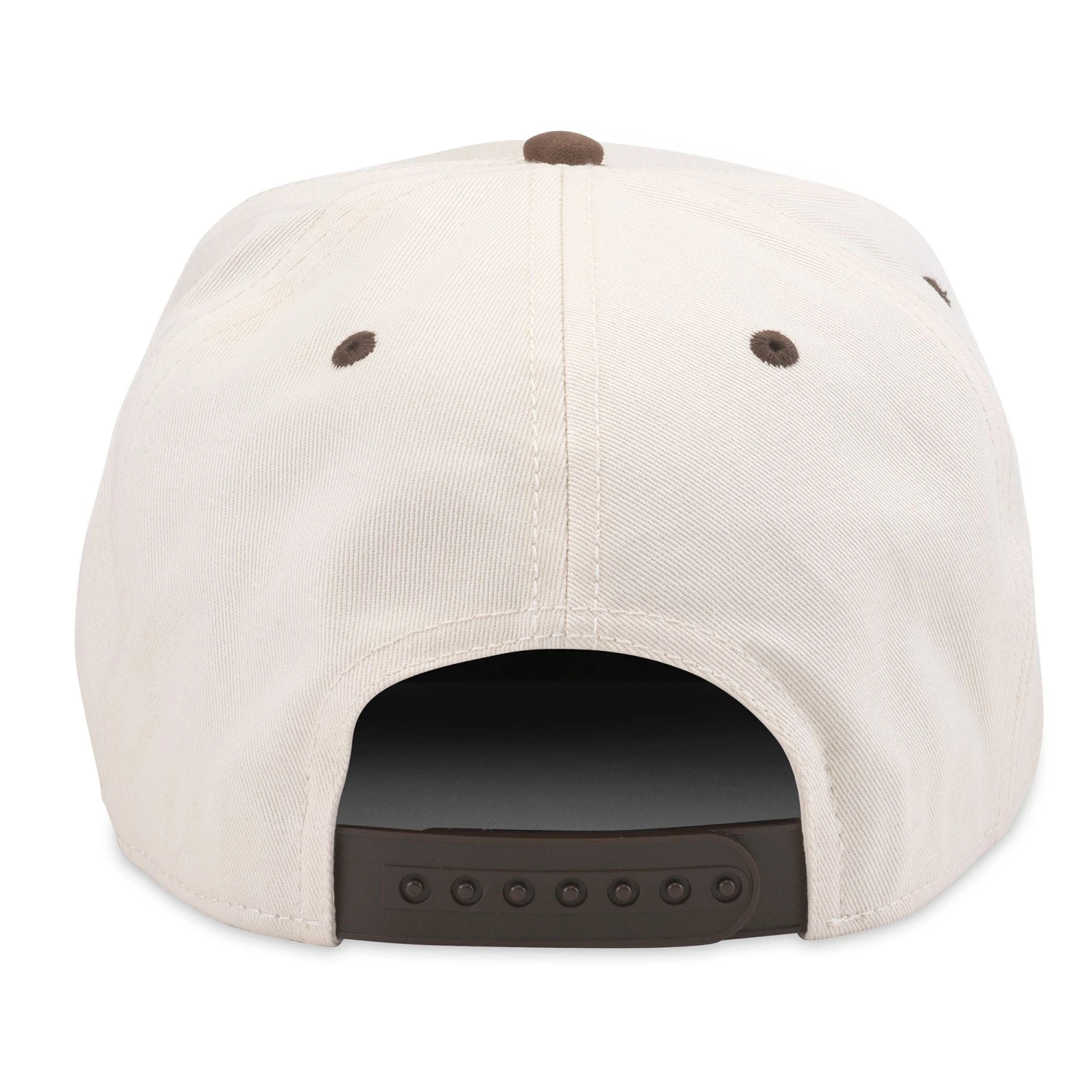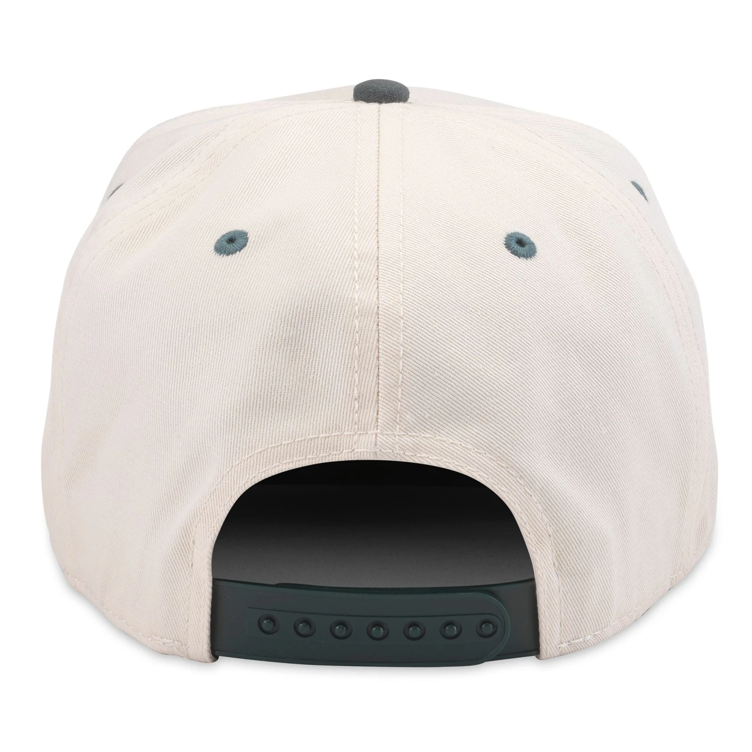 Washed cotton twill five-panel structured crown with mesh middle and back panels. Pre-curved visor and plastic snapback. Front panel stripes and logo are matte screen print.
